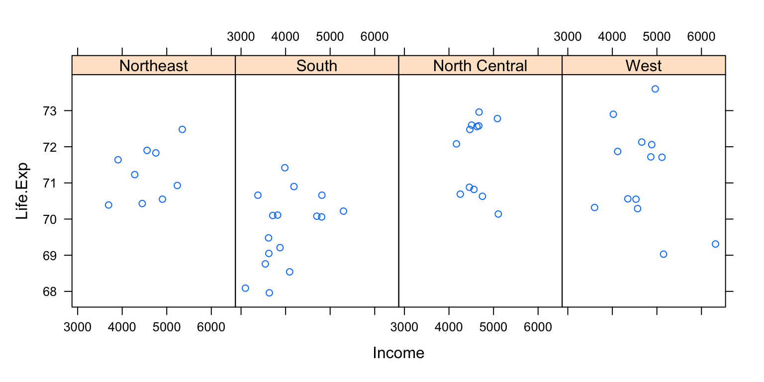 Here is an example of a lattice plot that looks at the relationship between life expectancy and income and how that relationship varies by region in the United States.