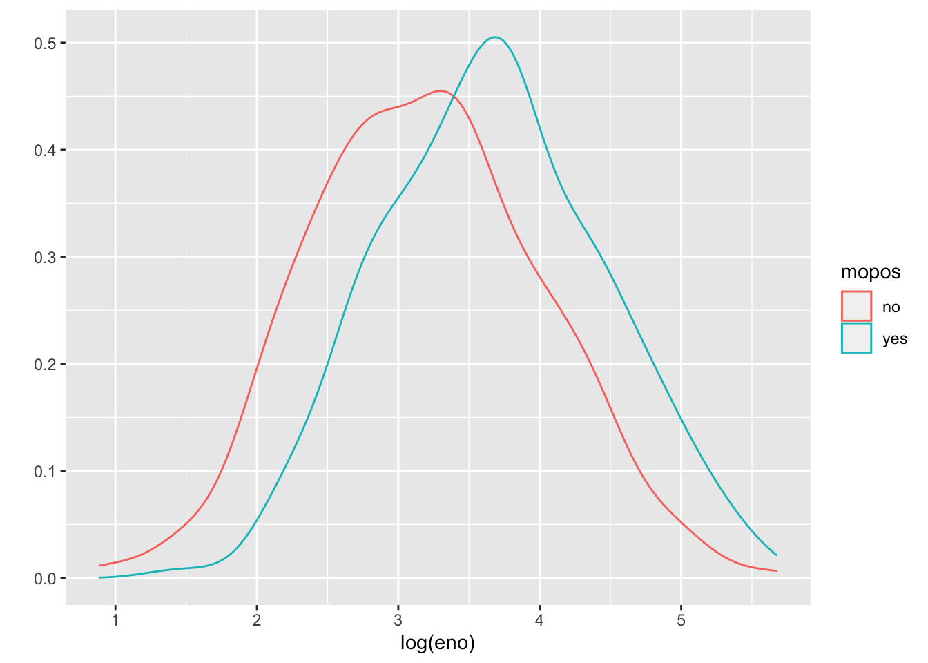 And here are the densities straitified by allergic status. We can map the color aesthetic to the mopos variable.