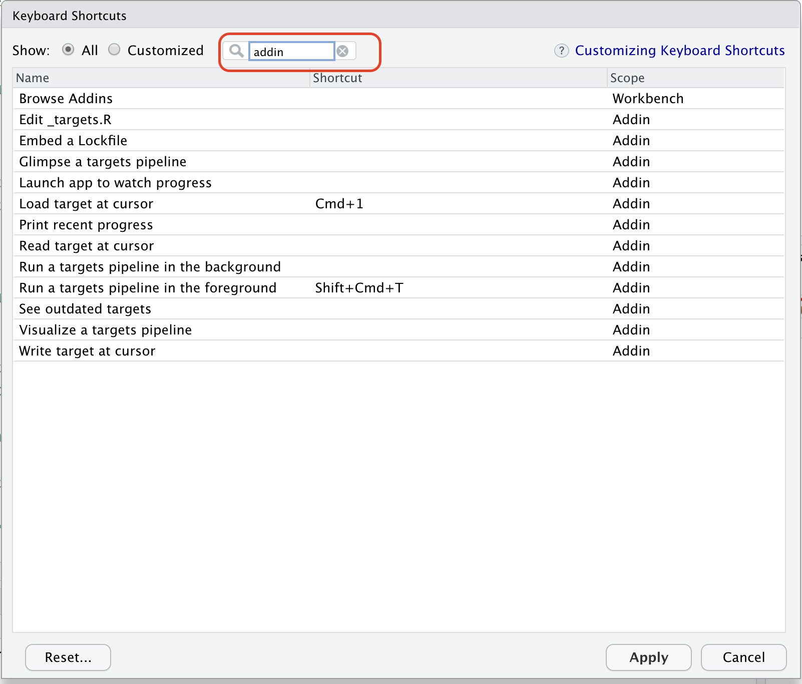 With in the pop-up keyboard shortcuts menu, you can search addin or targets or a specific target addin function, e.g. Load target at cursor in the search box. You can customize the keyboard shortcut by clicking on the input box within the Shortcut column.