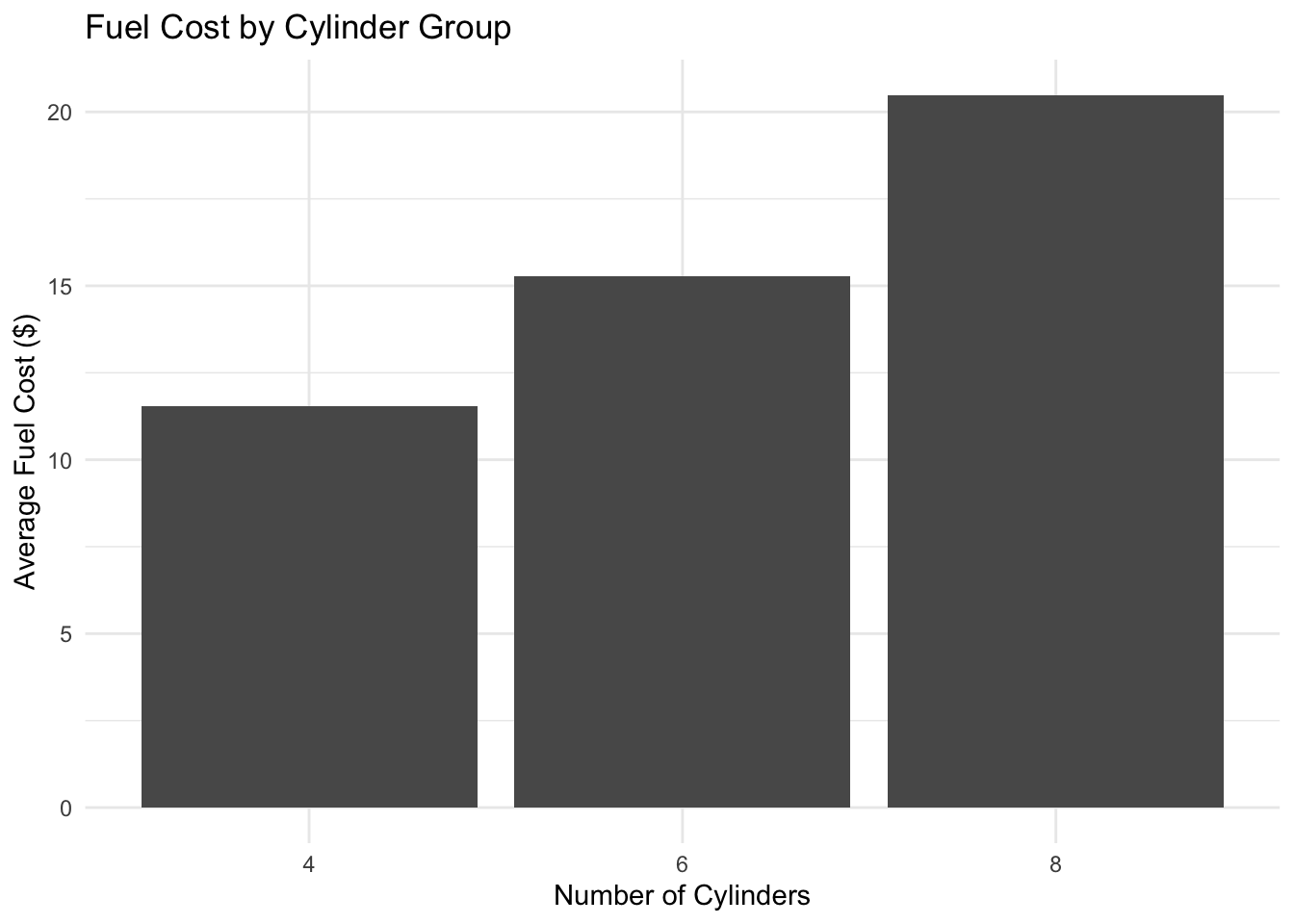 map()withggplot2, create a bar plot of the averagefuel_costfor eachcyl. For each cylinder group, plot the average values ofmpg,hp, andwt.