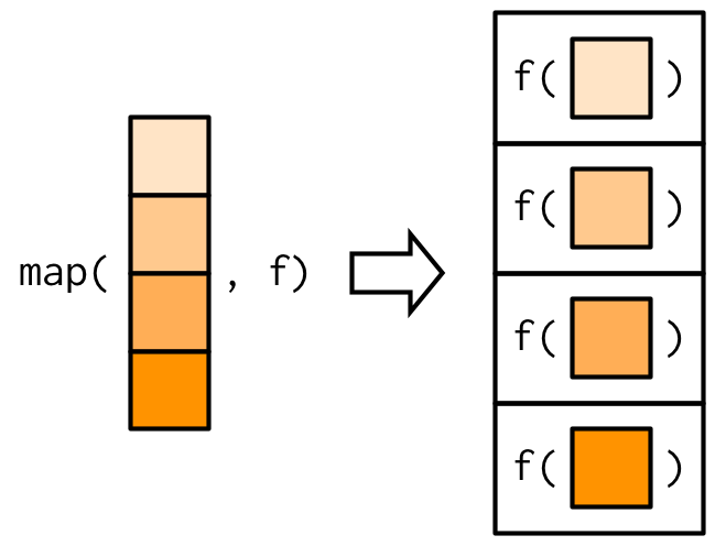 map familyThe most fundamental functional in the purrr package is the map(.x, .f) function. It takes a vector (.x) and a function (.f), calls the function once for each element of the vector, and returns the results in a list. In other words, map(1:3, f) is equivalent to list(f(1), f(2), f(3)).